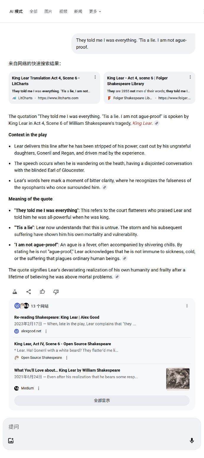 不仅在搜索主界面提供了 AI 模式的标签,甚至还会随机弹框提示用户切换到 AI 模式。而切换到 AI 模式后,用户看到的不仅不是传统搜索界面,甚至也不是搜索界面加 AI 摘要,而是以 AI 对话框为主体,搜索结果则变成配角。