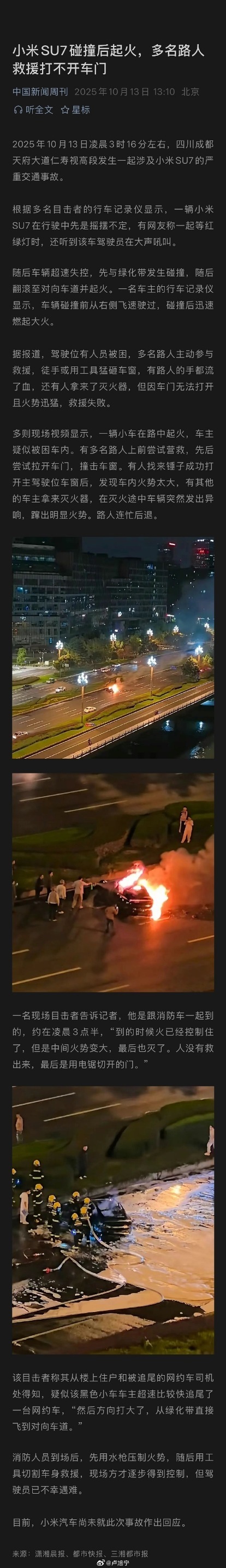【1】小米SU7碰撞后起火,多名路人救援打不开车门