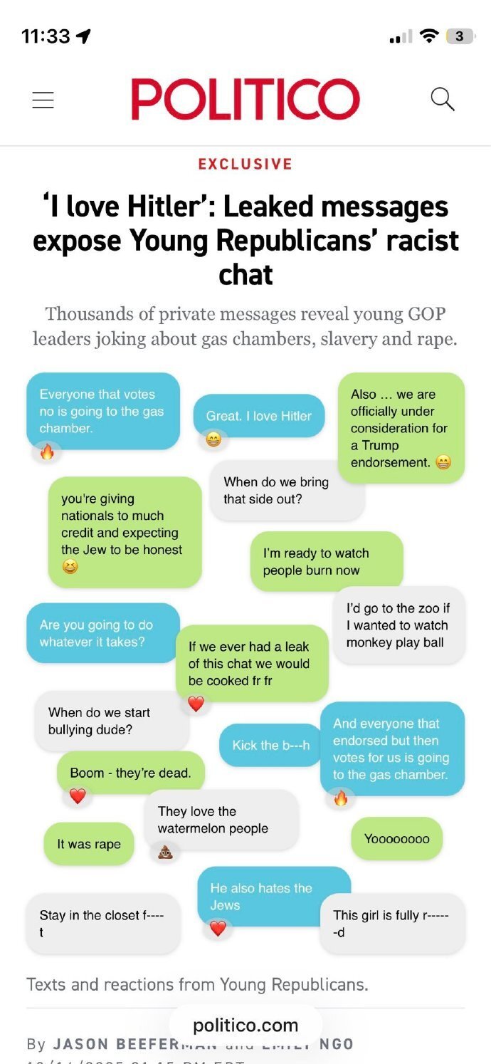 【5】【美国共和党新锐——自诩为“高等种族”,主张用毒气室毒杀不同政见者,满嘴种族主义言语,认同强奸,崇拜希特勒,主张消灭黑人和黄人,的共和党年轻一代精英领袖。】