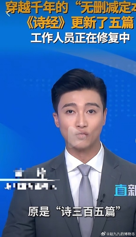 【8】刚看到一个报道,说海昏侯出土的《诗经》更新了五篇,比现在版本多出五篇,因为“诗三百”,主持人说以前是三百篇,现在出土这个是305篇
