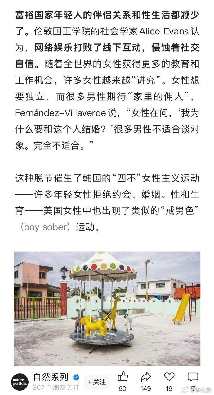 【10】《自然》(Nature)杂志的文章,世界各国都在见证生育率下降。韩国女性的“四不”主义——不约会、不结婚、不性交、不生育……