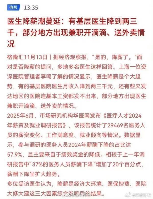 【4】医生降薪潮蔓延:有基层医生降到两三千,部分地方出现兼职开滴滴、送外卖情况