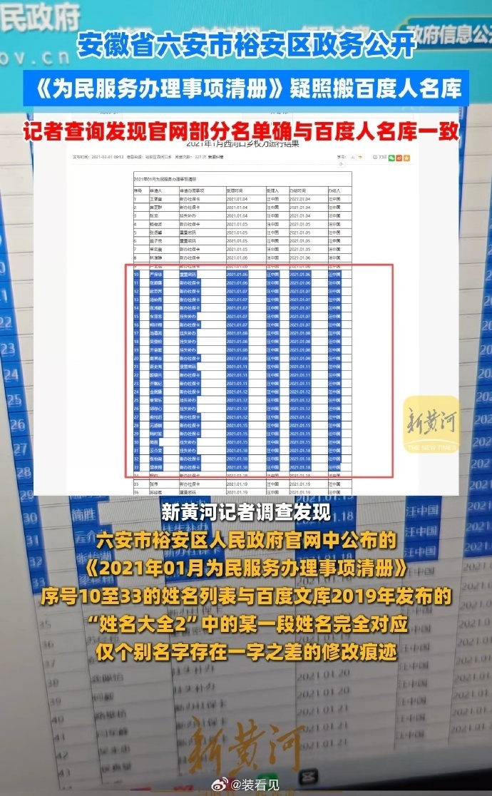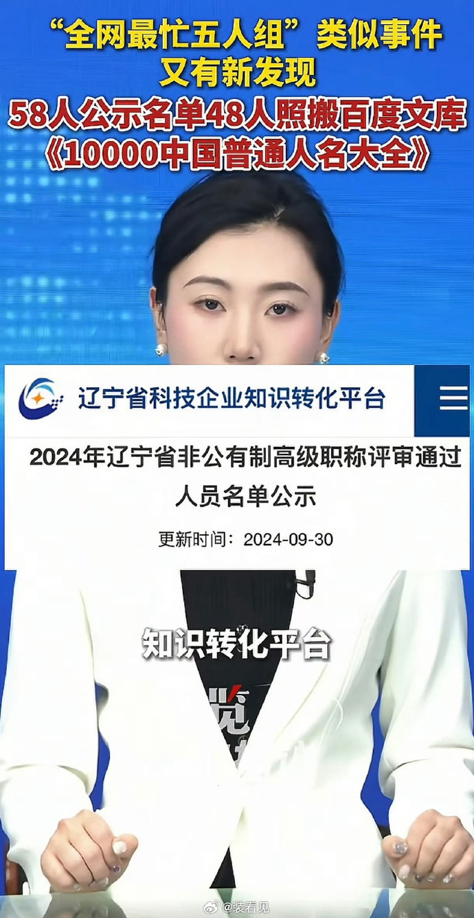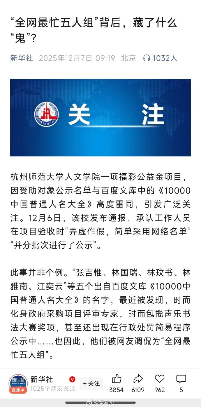 【5】全网最忙五人组又到了安徽。 到目前为止,五人组出没的地方有: 官方采购,书法大赛,电视台少儿春晚,声乐比赛,羽毛球比赛等等。 最牛的是辽宁,省级高级职称评审名单,公示的58人的大名单,其中48人都是从百度文库里搬来的。 更牛的是杭州师大福彩公益受助金发放名单,第一批62个人,名字完全相同,就连错别字都一样。 真的,他们已经连编几个名字都懒得编了。 新华社发问,全网最忙五人组背后,到底藏了什么鬼?