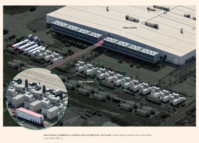 【8】根据金融时报,画面中是田纳西州孟菲斯的 xAI 机房,旁边排成一整列,是白色的天然气涡轮发电机,目的只有一个,自己发电、自己烧气,直接绕过早已满载的公共电网来撑算力。 这种配置在资料中心建置潮,已经相当常见,且为了因应算力需求,基本是24小时火力全开,导致当地环保团体跳出来抗议,直指它成了区域内最大的工业级污染源之一