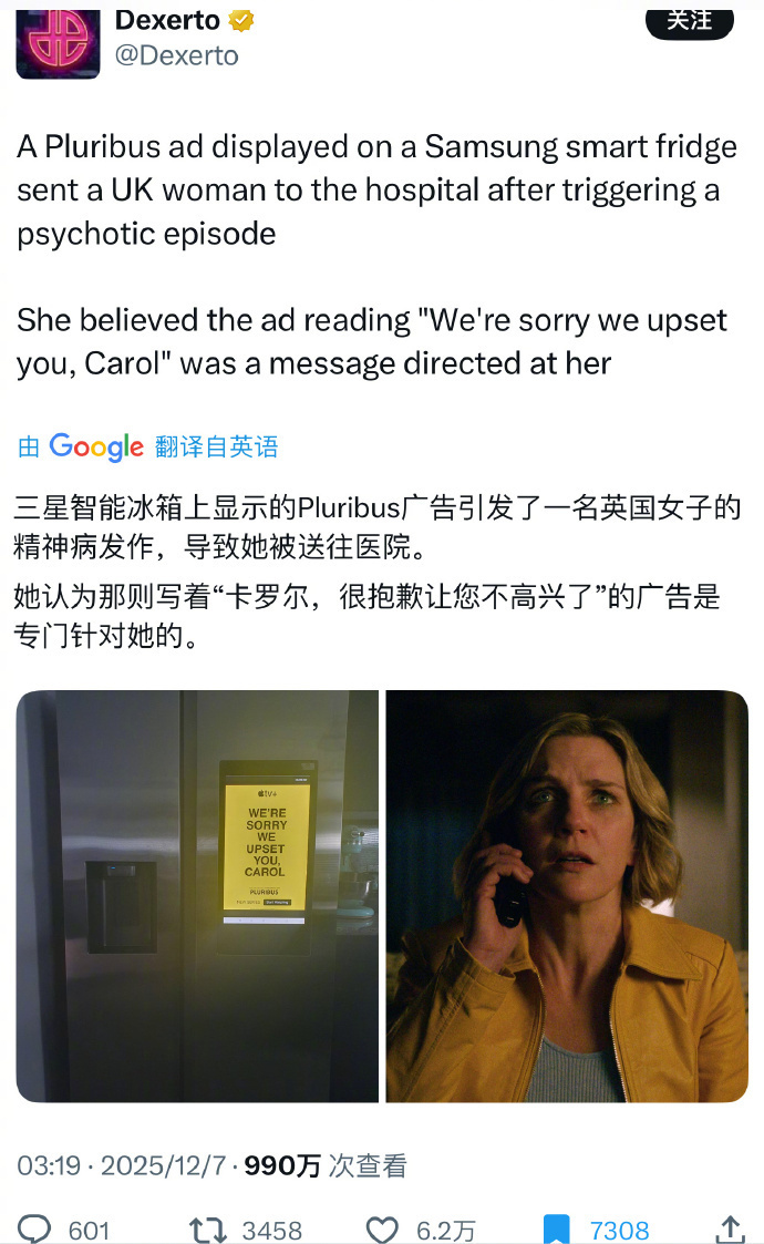 【2】《绝命毒师》制作人文斯·吉利根的新剧Plur1bus《同乐者/众生为一》的广告突然在智能冰箱上出现,把英国女子直接吓到精神崩溃,被送进医院。广告上写的是:“我们很抱歉让你不高兴了,卡罗尔。”女子以为这段话是针对她的……网友表示:为啥智能冰箱上会出现广告???