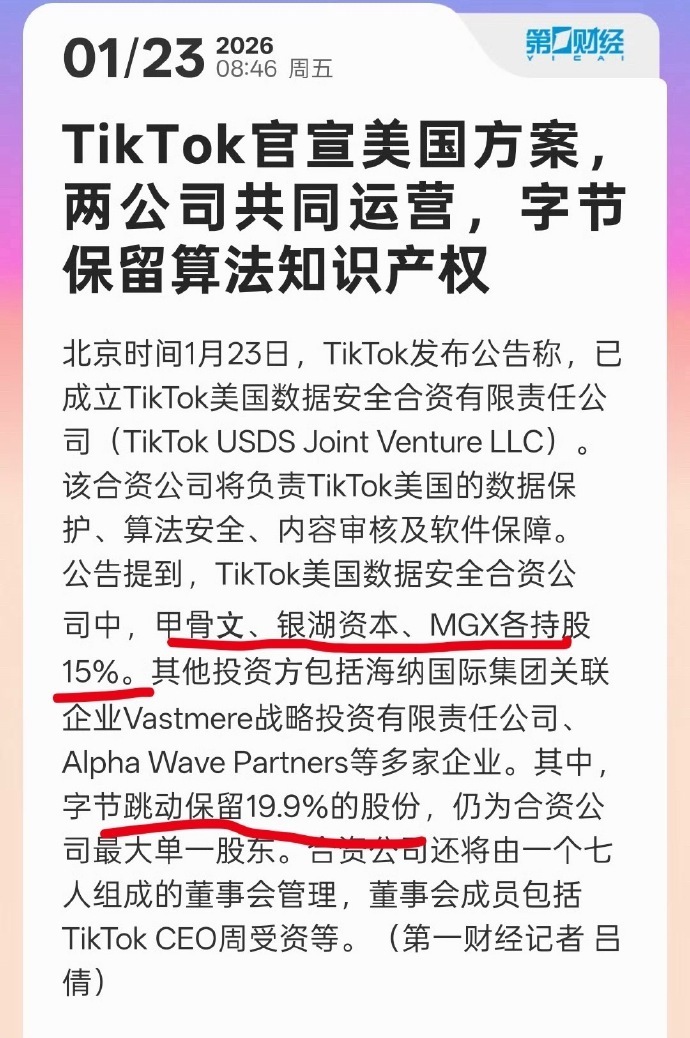 【4】#TikTok官宣美国方案#成立新的合资公司,TikTok保留算法和品牌独立性,全球运营不受影响。但美国由两公司共同运营。