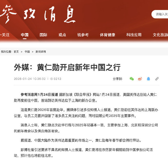 据新加坡《联合早报》网站1月24日报道,美国英伟达创始人黄仁勋再度前往中国,首站到访英伟达位于上海的新办公室。这是黄仁勋2026年首度赴华。据媒体引述多位知情人士报道,黄仁勋前往英伟达的上海新办公室,与员工见面并回答了诸多员工关注的问题,同时回顾公司2025年主要事件。消息人士称,黄仁勋此次赴华行程与2025年初基本一致,主要参加上海、北京和深圳分公司的新年晚会以及供应商答谢会。据报道,中国大陆作为英伟达最重要的市场之一,黄仁勋每年春节都会例行拜访。彭博社曾引述要求不具名的知情人士报道,黄仁勋将在农历新年假期前到中国参加公司活动,预计他也将前往北京。