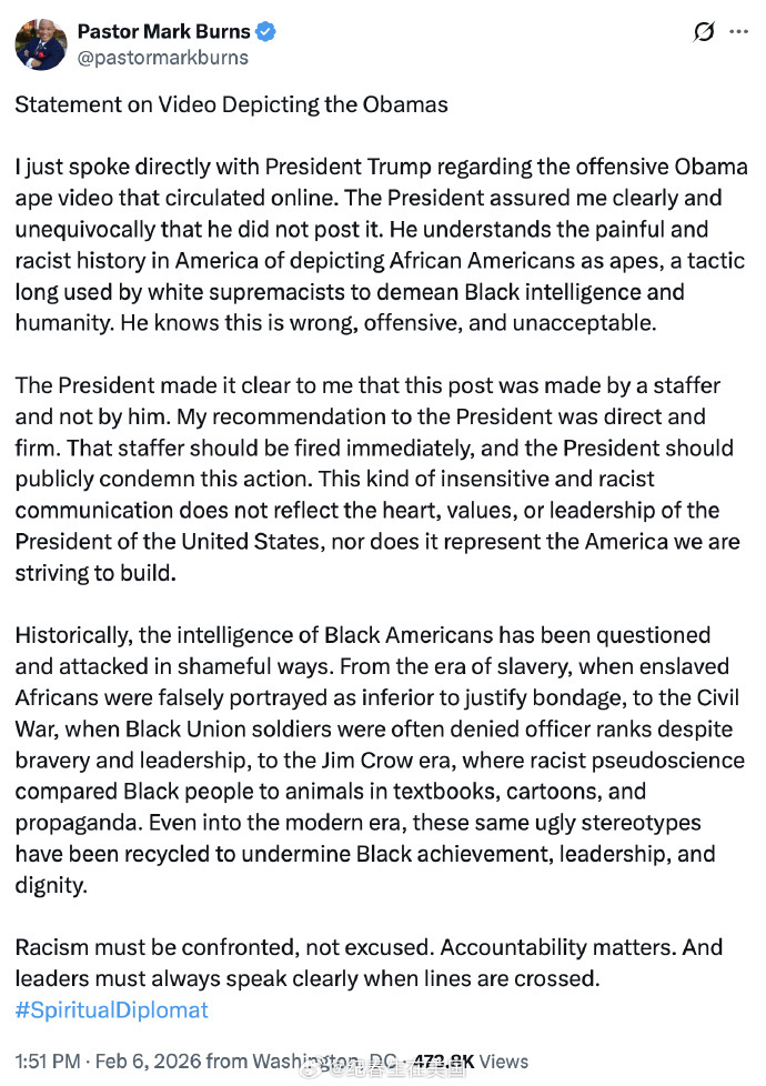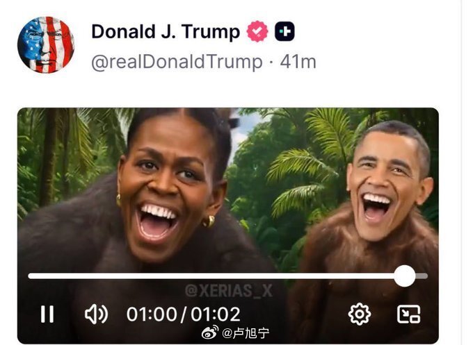 【11】特朗普视频影射奥巴马夫妇为猿猴 引发批评后撤下 美国总统特朗普的社媒账号Truth Social出现一段视频,影射民主党籍前总统奥巴马和前第一夫人米歇尔为猿猴,引发各界包括共和党人的强烈批评。白宫起初为视频辩护,但视频在发布了12小时后撤下。 昨晚川普又整活了。 他在自己的社交账号发布了一段视频,本意是重炒2020年大选“投票机舞弊”阴谋论,视频末尾短短1-2秒突然出现一段AI合成画面:奥巴马和米歇尔的脸被P到两只跳舞的猩猩/猿猴身上,配以《狮子王》经典BGM《The Lion Sleeps Tonight》。 这段恶搞源自某个右翼迷因(发布视频的人录屏结果第二段自动播放录进去了),把川普P成“丛林之王”狮子,其他民主党人P成动物,但把黑人夫妇P成猿猴,立刻被视为最恶毒的种族主义隐喻——历史上,美国白人至上主义者长期用“黑人=猴子/猿”来贬低黑人智力和人性。 事件曝光后,两党炸锅。民主党人怒斥“恶心”“无人性”“总统是种族主义怪物”;共和党内部也罕见反弹,黑人共和党参议员Tim Scott公开称这是“白宫做过的最种族主义的事”。民权组织、加州州长办公室等要求所有共和党人谴责。 白宫先硬扛,发言人Karoline Leavitt称这是“假装愤怒”,只是把川普比作狮子、民主党人比作狮子王角色;几小时后迫于压力改口:一名白宫工作人员错误发布,随后删除原帖,并甩锅给“工作人员”。 更戏剧性的是,川普的铁杆支持者、黑人牧师Mark Burns(TIME杂志称其为“川普顶级牧师”)直接打电话给川普,要求解释。 Burns在X上发长文声明:他直接且坚定建议川普立即解雇该工作人员,并公开谴责;川普回应称自己“没发帖”,清楚知道把非裔美国人比作猿猴的“痛苦种族主义历史”,承认这是“错的、冒犯的、不可接受的”。Burns强调种族主义必须直面、问责,不能原谅,并回顾从奴隶制到现代的恶劣历史。 黑人牧师Mark Burns: “我刚刚就这段在网上流传、极具冒犯性的“奥巴马被比作猿猴”的视频,直接与川普总统通了话。总统向我明确、毫不含糊地保证,这段视频并非由他发布。他清楚地认识到,在美国历史上,把非裔美国人描绘成猿猴是一种极其伤人、带有强烈种族主义色彩的做法,长期被白人至上主义者用来贬低黑人群体的智力与人性。他知道这不仅是错误的,更是冒犯且不可接受的。 总统也向我说明,这条内容是由一名工作人员发布的,并非出自他本人。我对总统的建议直截了当、态度坚决:这名工作人员应当立即被解雇,总统也应公开谴责这一行为。这种冷漠而带有种族歧视的信息,既不代表美国总统应有的良知、价值观和领导力,也不代表我们努力建设的那个美国。 从历史上看,非裔美国人的智力曾被以极其可耻的方式不断质疑和攻击。从奴隶制时期,为了给奴役找借口而把被奴役的非洲人描绘成“低等人”;到南北战争时期,尽管黑人联邦军士兵英勇善战、具备领导才能,却常常被拒绝授予军官军衔;再到“吉姆·克劳”时代,种族主义的伪科学在教材、漫画和宣传中把黑人与动物相提并论。即便到了现代,这些丑陋的刻板印象仍被反复拿出来,用以打压黑人的成就、领导力与尊严。 种族主义必须被正面面对,而不是被纵容或开脱。追责至关重要。当底线被踩踏时,领导者必须清楚、明确地发声。” #特朗普拒绝道歉#特朗普拒绝为种族主义视频道歉,称自己只观看了这段视频的前半部分,并没有看到包含冒犯性内容的最后几帧画面。 记者:白宫方面说那段视频是一位工作人员发的。你会解雇这位工作人员吗? 特朗普:不会。我看过了。我没看完,我刚刚看了第一部分。是关于某个地方的选民欺诈,我把视频给了他们,他们把它发布了。 记者:你会道歉吗? 特朗普:不,我没做错。那是模仿《狮子王》。