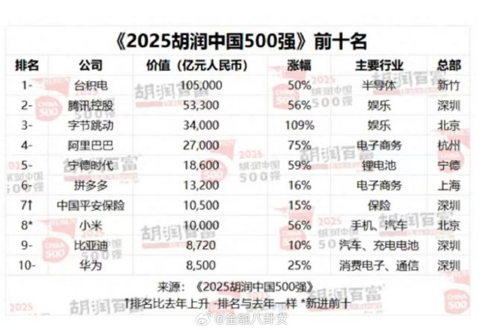 【6】2025胡润中国500强榜发布:台积电蝉联第一,小米超越华为首次进入前十