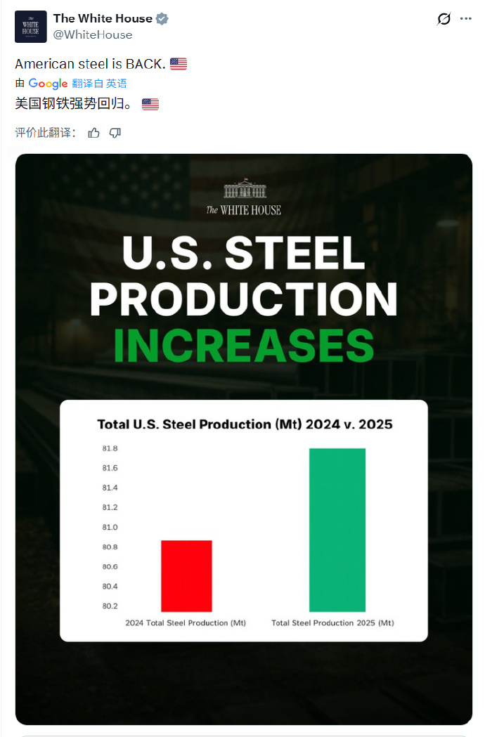 【14】@paingod 白宫真是特么出人才,原来图还能这么画呢:阿川上台前后,2024和2025年美国钢产量对比图 又学了一招 太先进了