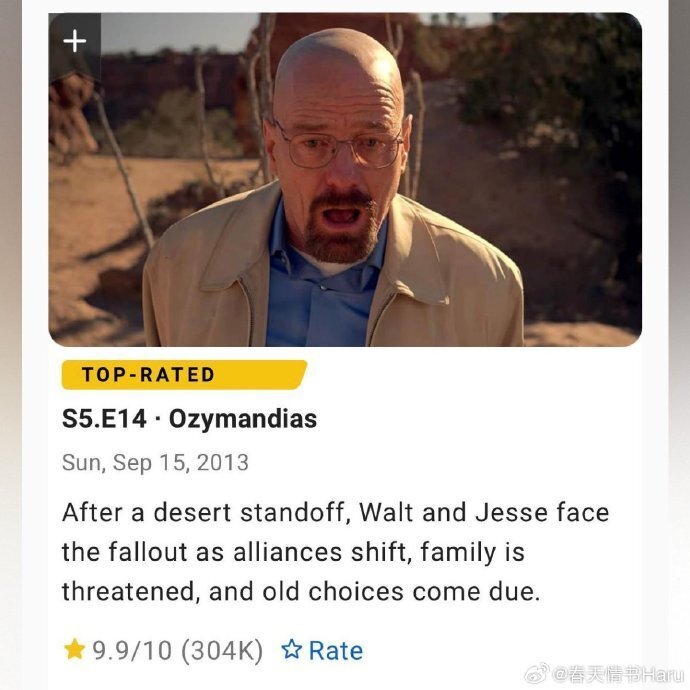 【11】《绝命毒师》的粉丝为了防止《七王国的骑士》的第五集In the Name of the Mother成为IMDb上第二个10分的单集(开分9.9分),发起了刷一星的活动,成功将该集刷到了9.7分。 《权力的游戏》粉丝则因此集体去刷《绝命毒师》的满分单集Ozymandias的低分,该集在昨天从保持了13年的满分下降至9.9分