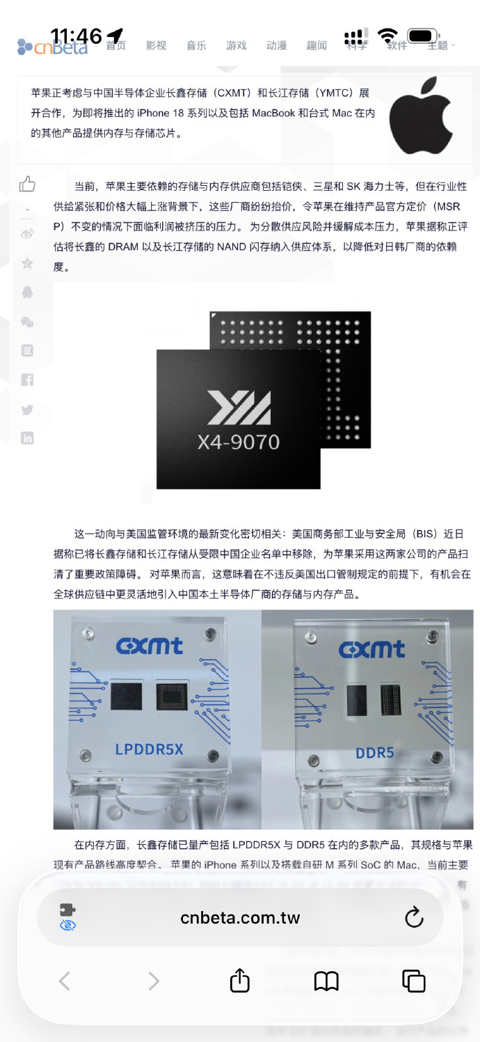 【2】《苹果正考虑引入长鑫、长江存储为新一代产品提供内存与闪存》