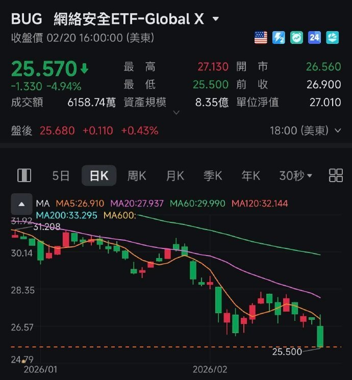 【7】Claude再次引爆美软件股恐慌!网络安全股遭抛售,新代码工具让传统安全手段失灵? 当地时间 2 月 20 日,美股网络安全板块集体跳水。CrowdStrike 收跌约 8%,Cloudflare 跌逾 8%,Okta 下挫 9.2%,SailPoint 跌去 9.4%,Zscaler 丢了 5.5%。追踪全球网络安全公司的 Global X Cybersecurity ETF(代码 BUG)当日收跌 4.9%,报收于 2023 年 11 月以来的最低位。触发抛售的,是 Anthropic 当天发布的一款名为 Claude Code Security 的代码安全工具。 网络安全又被杀了个血流成河,被它一路“杀”掉的市值早已数万亿,结果 Anthropic 自己估值才几千亿。