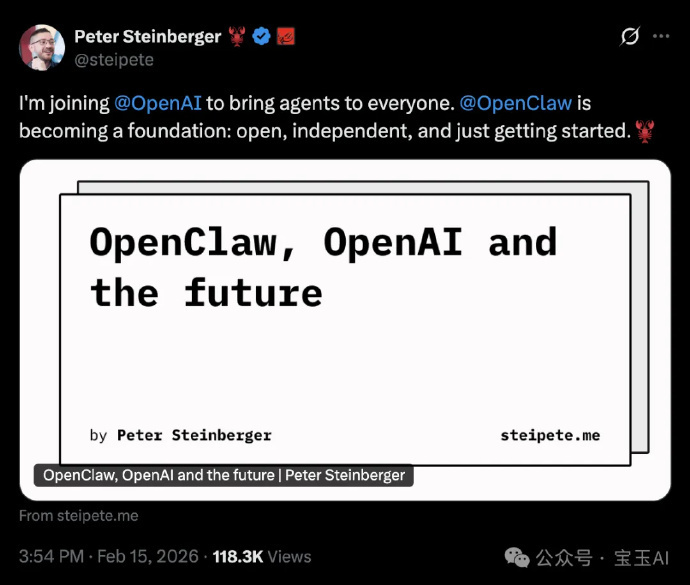 【6】@宝玉xp OpenClaw 创始人 Peter Steinberger 加入 OpenAI Sam Altman 刚在 X 上宣布,开源 AI 智能体项目 OpenClaw 的创始人 Peter Steinberger 正式加入 OpenAI,将负责推动下一代个人智能体的开发。 Peter Steinberger 是一位奥地利开发者,此前曾创办 iOS 开发工具公司 PSPDFKit 并以超过1亿美元的价格出售。2025年11月,他用大约一个小时将聊天应用与 Claude Code 连接起来,做出了一个名为 Clawdbot 的 AI 智能体原型——这个智能体可以通过聊天平台自主执行任务,甚至能修改自己的源代码。项目因 Anthropic 的商标投诉而两度更名,最终定名为 OpenClaw。 OpenClaw 迅速走红,在 GitHub 上获得超过18万颗星,吸引了硅谷和中国开发者的广泛关注。此前 Steinberger 在 Lex Fridman 的播客中透露,Meta 和 OpenAI 都向他抛出了橄榄枝,扎克伯格甚至通过 WhatsApp 直接联系他。最终他选择了 OpenAI。 根据 Altman 的声明,OpenClaw 将作为开源项目继续存在于一个基金会中,OpenAI 会持续支持。Altman 强调,未来将是"极度多智能体"的时代,而支持开源是这一愿景的重要组成部分。 这可能是 Anthropic 近年来最大的战略失误。想想看:史上增长最快的开源项目之一,名字直接致敬你家的产品,绝大多数用户都是 Claude 的重度用户,项目底层跑的就是 Claude Code。这本来是一个梦寐以求的生态故事,Anthropic 却选择了发律师函。