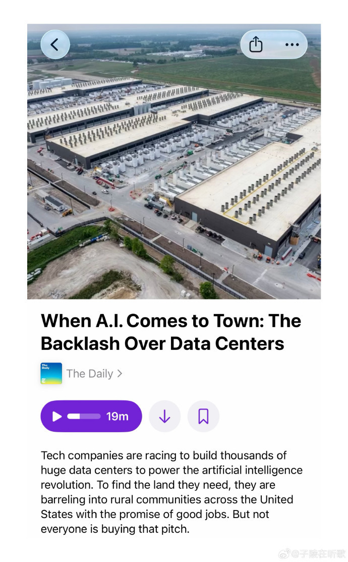 【8】@子陵在听歌 今天The Daily讲了个非常有趣的故事。去年一年仅Amazon、Google、Meta、Microsoft四家公司就在美国投资了近4000亿美元建设应用于AI的数据中心(data center),这些投资相当于很多国家的GDP。美国全国范围内开始了数据中心基建的扩张。今天的故事讲了一个在偏远的印第安纳州小镇New Carlisle与这些数据中心的博弈。 在印第安纳州圣约瑟夫县(St. Joseph County)的New Carlisle镇,原本宁静的农业地景正在经历一场翻天覆地的巨变。几十年来,这里的节奏由庄稼的生长周期决定,但如今,数千英亩的肥沃农田正迅速消失,取而代之的是被称为“megasites”的庞大工业禁区。 这场变革的核心是AI基础设施的疯狂扩张。Amazon正斥资约110亿美元在此打造该州历史上规模最大的data center集群,而Google等巨头也紧随其后。地方官员和科技公司向村民们描画了一幅“双赢”的蓝图:丰厚的税基、改善的学校资金,以及通往未来高科技经济的入场券。然而,对于生活在这里的居民来说,这种承诺更像是一种掠夺。 随着建设的推进,当地的抵制声浪愈发强烈,居民们在实地考察中戳破了所谓的“就业幻象”。他们发现,虽然施工期间需要大量建筑工人,但一旦这些巨大的无窗方块落成,内部只会留下极少数的“skeleton crew(骨干团队)”来维持服务器的运转。相比于其庞大的物理体积,这些data center本质上只是安静却贪婪的“机器仓库”。 更令社区感到不安的是资源分配的极度不公。为了给Nvidia等公司的高性能AI芯片散热,这些设施每天需要消耗数百万加仑的水,并占用海量的电力资源。居民们开始担心自家的水井会干涸,更愤怒于自己可能需要通过上涨的公用事业账单,来变相资助“Big Tech”所需的巨大能源基础设施。 NYT记者Karen Weise记录下的那场小镇市政厅会议(Town Hall),将这种“硅谷速度”与“乡村节奏”的冲突推向了高潮。会议现场气氛紧绷得如同拉满的弓,村民们面对的不仅是几张规划图纸,而是一场他们无法理解、也无法拒绝的“闪电战”。一名当地居民在发言中愤怒地质疑:“为什么我们要为了让远在加州的人能更快地生成一张AI图片,就牺牲掉我们祖辈传下来的地下水?”这场Town Hall一直开到了凌晨四点。以否决在这里建立数据中心告终。 更有趣的是科技巨头与地方政府在会上的“话术”。官方极力宣扬这是一个能让下一代留在家乡的高科技机遇,但台下的农民们却报以苦笑。他们很清楚,这些耗资百亿的data center围墙高耸、保安森严,内部几乎不需要人力。这种“无声的邻居”不仅没有带来预想中的社区活力,反而像一块巨大的黑洞,默默吞噬着电力和水分。 这种“新型淘金热”的贪婪感在会上表现得淋漓尽致。当居民询问关于环境影响的细节时,得到的往往是模糊的合规承诺。这种信息的不对称让村民们感到一种深层的“unnerved(不安)”:科技公司正以雷霆之势席卷任何拥有平整土地、电网接口和优惠税法的农村县,其速度快到让当地的zoning boards(规划委员会)和普通百姓根本来不及做出反应。昔日星空下的田野,正迅速演变为支持全球AI革命的冰冷“大脑”,而小镇原本的灵魂则在这一进程中被无声地抹去。 我觉得最有意思的是,虽然这是美国极度偏僻保守的地方,但一旦地方政策威胁到普通人的民生,大家依然想通过Town Hall投票解决问题;所以这跟这种深红选取的极右翼的政治身份反差极大。也就是说,当他们的生活收到了实际威胁,他们会团结起来支持一种民主手段解决问题;而不是像Jan 6那样去搞暴动。