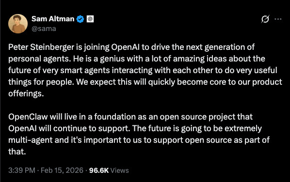 【6】@宝玉xp OpenClaw 创始人 Peter Steinberger 加入 OpenAI Sam Altman 刚在 X 上宣布,开源 AI 智能体项目 OpenClaw 的创始人 Peter Steinberger 正式加入 OpenAI,将负责推动下一代个人智能体的开发。 Peter Steinberger 是一位奥地利开发者,此前曾创办 iOS 开发工具公司 PSPDFKit 并以超过1亿美元的价格出售。2025年11月,他用大约一个小时将聊天应用与 Claude Code 连接起来,做出了一个名为 Clawdbot 的 AI 智能体原型——这个智能体可以通过聊天平台自主执行任务,甚至能修改自己的源代码。项目因 Anthropic 的商标投诉而两度更名,最终定名为 OpenClaw。 OpenClaw 迅速走红,在 GitHub 上获得超过18万颗星,吸引了硅谷和中国开发者的广泛关注。此前 Steinberger 在 Lex Fridman 的播客中透露,Meta 和 OpenAI 都向他抛出了橄榄枝,扎克伯格甚至通过 WhatsApp 直接联系他。最终他选择了 OpenAI。 根据 Altman 的声明,OpenClaw 将作为开源项目继续存在于一个基金会中,OpenAI 会持续支持。Altman 强调,未来将是"极度多智能体"的时代,而支持开源是这一愿景的重要组成部分。 这可能是 Anthropic 近年来最大的战略失误。想想看:史上增长最快的开源项目之一,名字直接致敬你家的产品,绝大多数用户都是 Claude 的重度用户,项目底层跑的就是 Claude Code。这本来是一个梦寐以求的生态故事,Anthropic 却选择了发律师函。