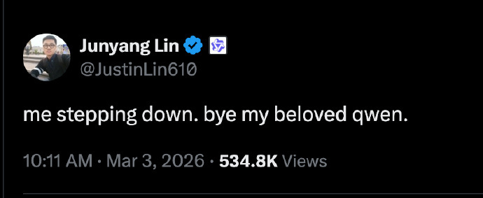 【3】Qwen 技术负责人 Junyang Lin 今天在 X 上发了一条简短的告别:“me stepping down. bye my beloved qwen."(我退出了。再见,我挚爱的 Qwen。)