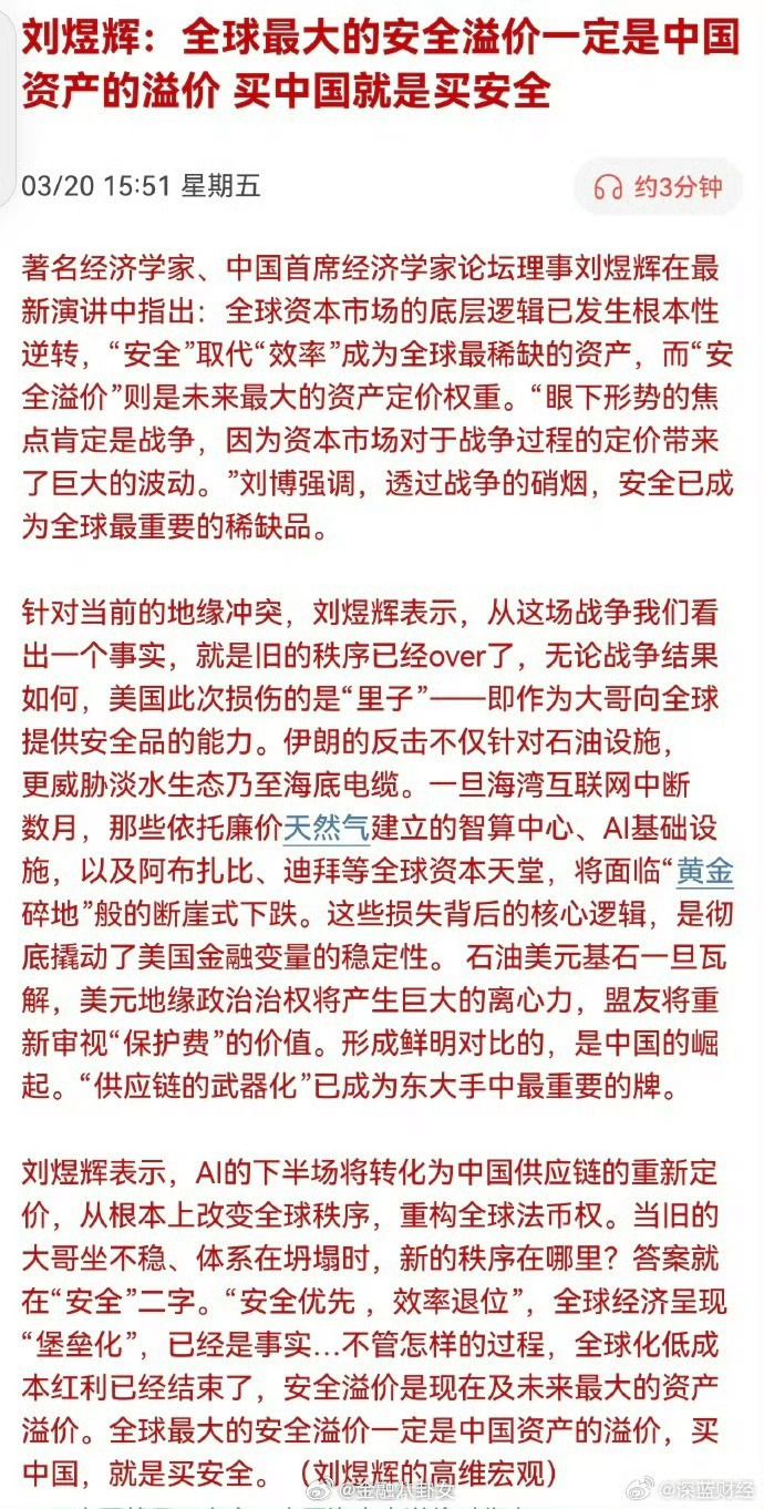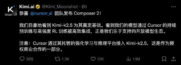【2】Kimi称Cursor已授权 3月21日,@月之暗面Kimi发布声明:恭喜cursor ai 团队发布Composer 2! 我们自豪地看到Kimi-k2.5为其奠定基础。看到我们的模型通过Cursor的持续预训练与高强度RL 训练被高效集成,正是我们乐于支持的开放模型生态。 注意:Cursor通过其托管的强化学习与推理平台接入Kimi-k2.5,这是作为授权商业合作的一部分。 【】刘煜辉:全球最大的安全溢价一定是中国资产的溢价, 买中国就是买安全。