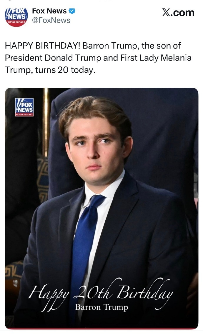 【11】福克斯新闻也是够扯淡的,居然发一条川普小儿子满20岁的消息,结果下面全是要求将他送到伊朗前线的评论。