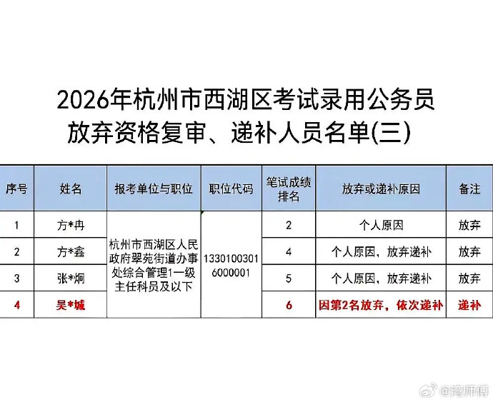 【1】杭州西湖区一个公务员岗位,招1个人,结果第2、第4、第5名全跑了,硬是让笔试第6名给捡漏进了面试 大梦方觉三十自醒:刚学了一词“公考围岗”