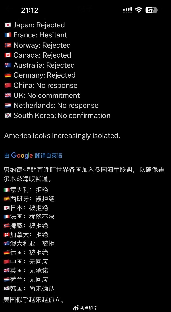 【10】美国网友统计了下,川普发出呼吁希望各国参与霍尔木兹海峡行动后各国的表态。