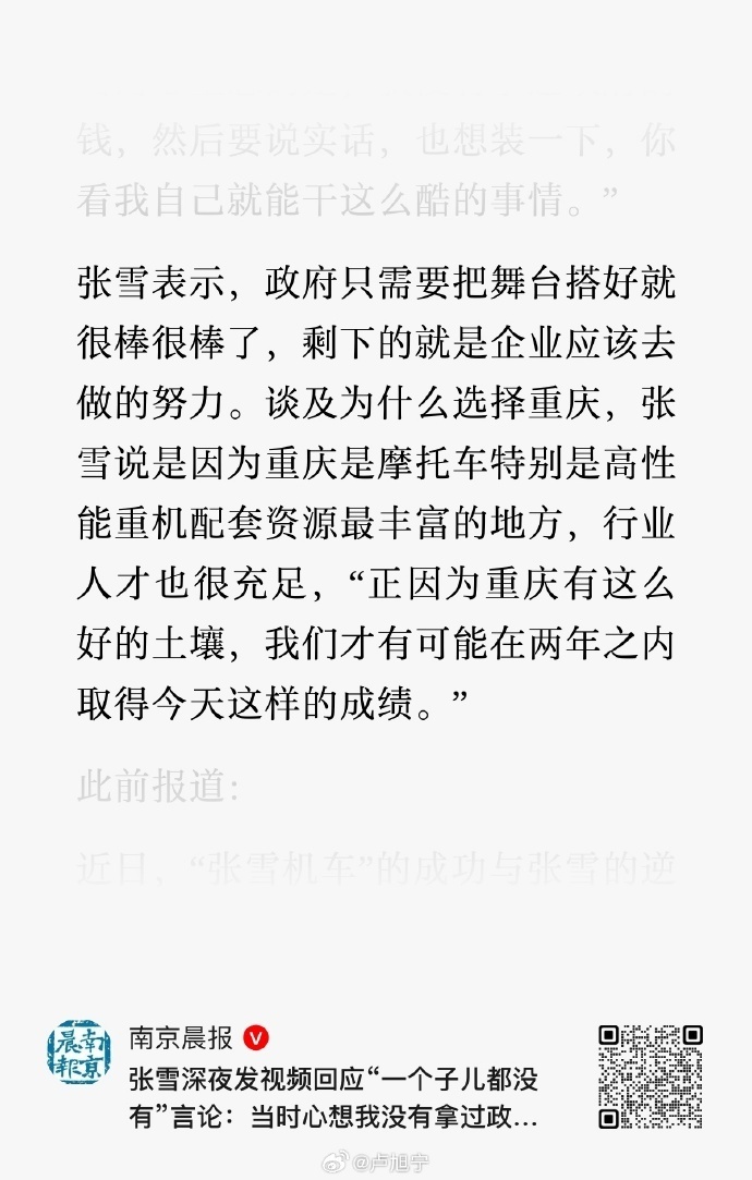 【2】张雪深夜发视频回应“一个子儿都没有”言论:当时心想我没有拿过政府的钱,说实话想装一下,你看我自己就能干这么酷的事情
