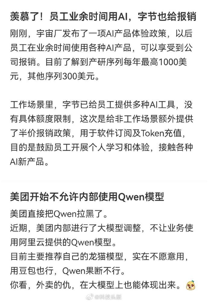 【5】大厂对待外部AI态度各不相同,美团、京东屏蔽竞对大模型,字节鼓励员工业余时间体验AI还能半价报销。