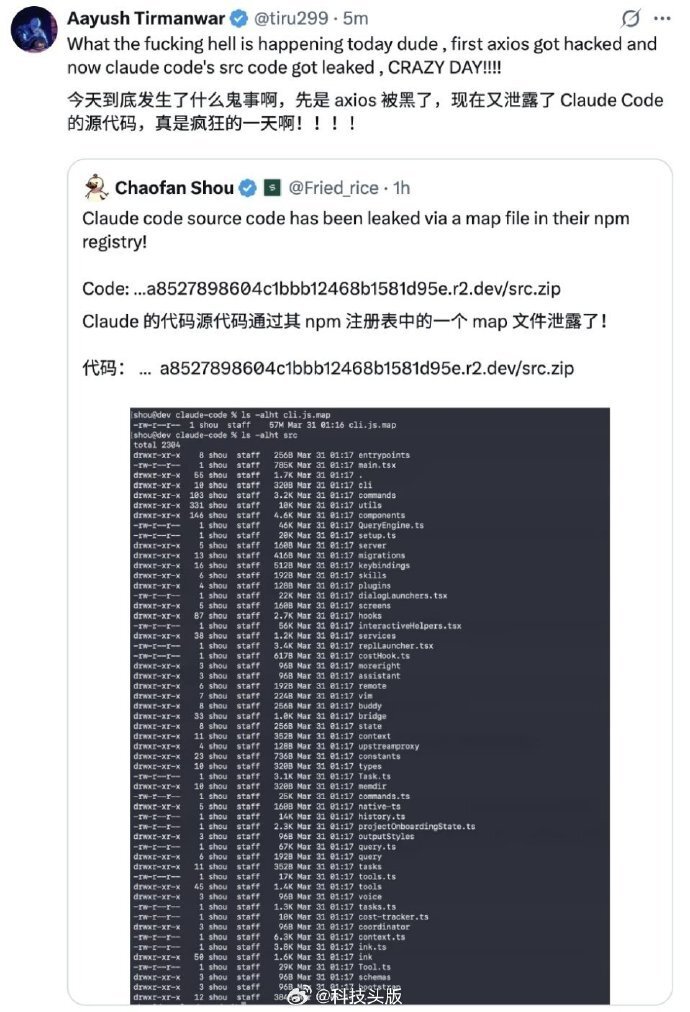 【9】Anthropic源码遭泄露 北京时间3月31日,开发者群体发现,美国大模型头部公司Anthropic 因构建配置失误,意外通过 npm 注册表中的源映射文件泄露了 Claude Code (编程工具)源代码。据披露,Claude Code npm 软件包包含一个 57MB 的源码映射文件,该文件泄露了约 1900 个 TypeScript 源码文件,代码总行数超过 51.2 万行,涵盖完整代码库、工具、命令以及尚未发布的功能。Anthropic核心基座模型依然完全闭源,未受影响。