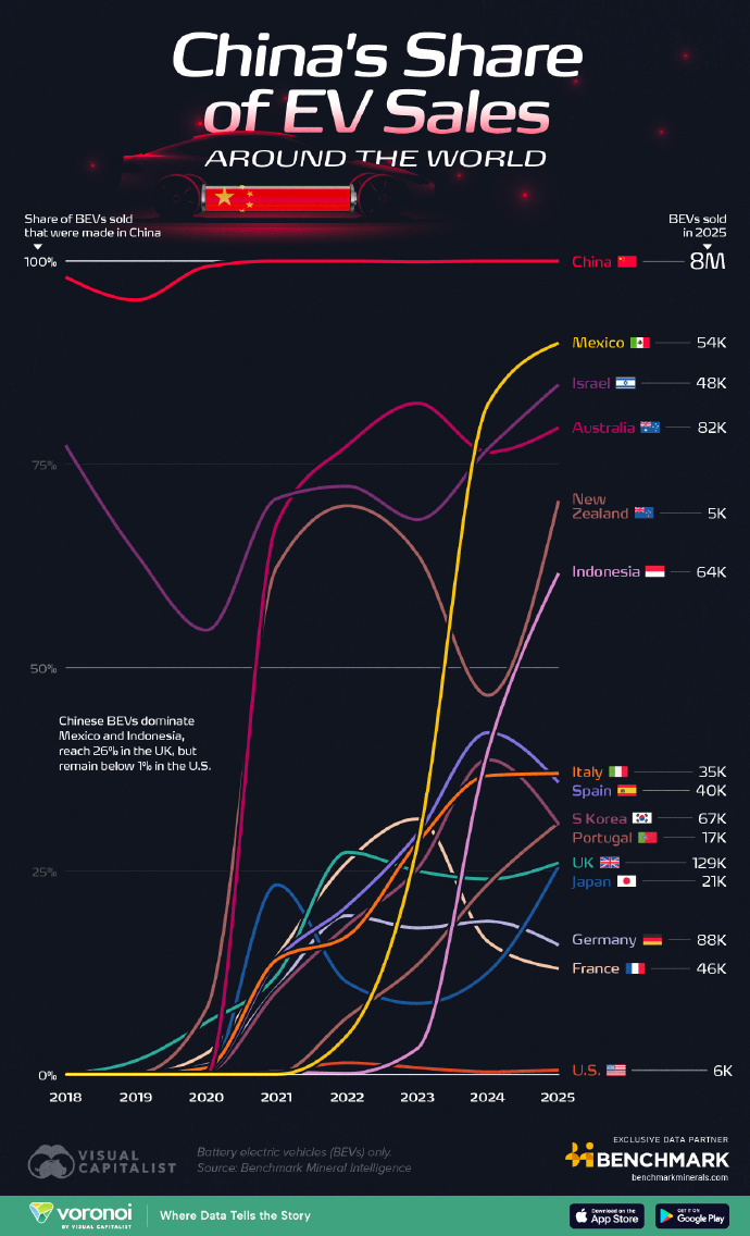 【3】中国电动汽车在不同国家的市场份额。中国制造的电动汽车占墨西哥市场销量的近90%,在印度尼西亚占60%以上。占英国销售额的26%,但在美国仍低于1%。