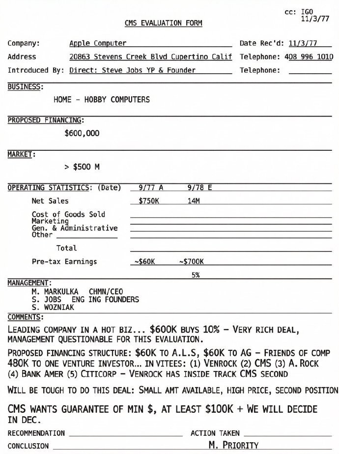 【3】苹果公司迎来50周年,红杉资本也分享了1977年的投资备忘录,图1是看不太清楚的手写原件,图2是AI修复后的机打文件。 红杉面对的交易是用60万美金换取苹果10%的股份,在备忘录里,红杉评估「太贵了」(Very Rich Deal),而且不太看好苹果的管理层。 当时苹果的CEO马库拉就是红杉推荐过去当班干部的,所以不看好的管理层当然指的就是乔布斯和沃兹尼亚克了⋯⋯
