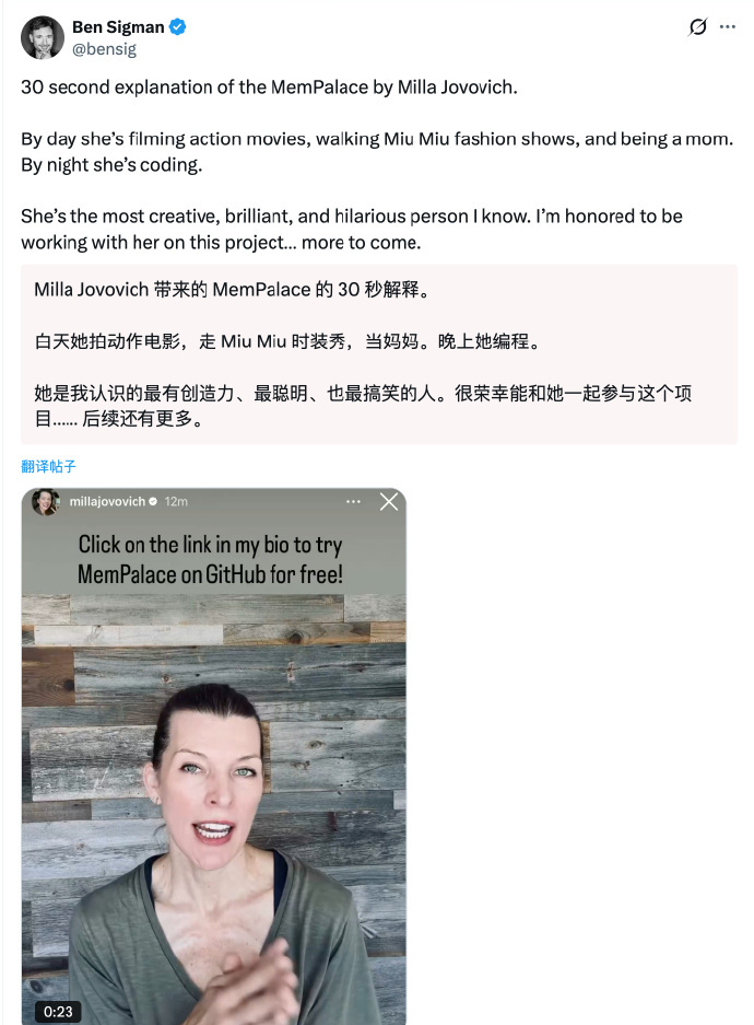 【6】Milla Jovovich(米拉・乔沃维奇)公布开源免费 AI 记忆系统 MemPalace 没错,就是那个演过 《第五元素》、《生化危机》等电影的女演员,和朋友 Ben Sigman 在 GitHub 开源了一个 AI 记忆系统 MemPalace,在 LongMemEval 跑分中获得了有史以来的最高分数。 白天演电影、走秀、带娃,晚上 Vibe Coding,太酷了! 🔗:github.com/milla-jovovich/mempalace
