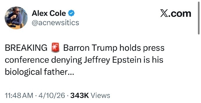 【14】继川普老婆突然出来声明自己不是爱泼斯坦朋友之后,川普的小儿子也莫名其妙地跑出来弄个新闻发布会,说爱泼斯坦不是他的爸爸。 川普又在教科书般地玩弄那套转移注意力的手法,这次他需要转移注意力的事件是伊朗战争。