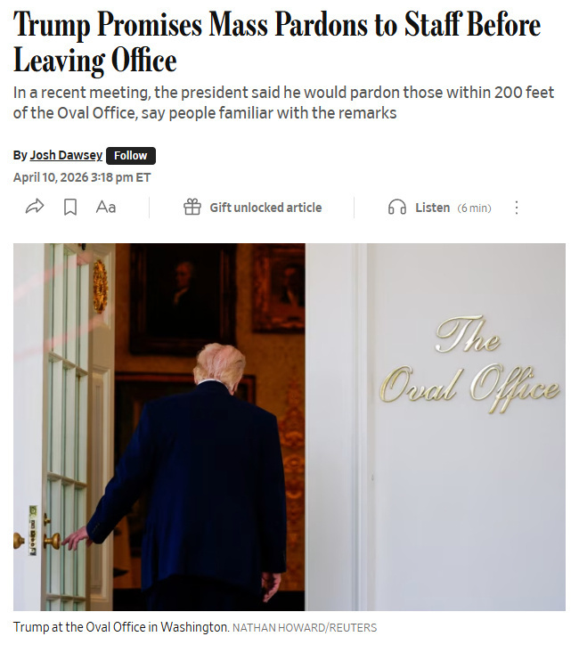 【17】华尔街日报把这条新闻的读者评论功能关了。 据知情人士透露,特朗普在最近的一次会议上说:“我会赦免所有接近椭圆形办公室200英尺以内的人。”随着总统重复这句话,这个范围似乎在扩大。今年早些时候与特朗普会面的另一位人士说,总统曾开玩笑说赦免任何接近10英尺以内的人。