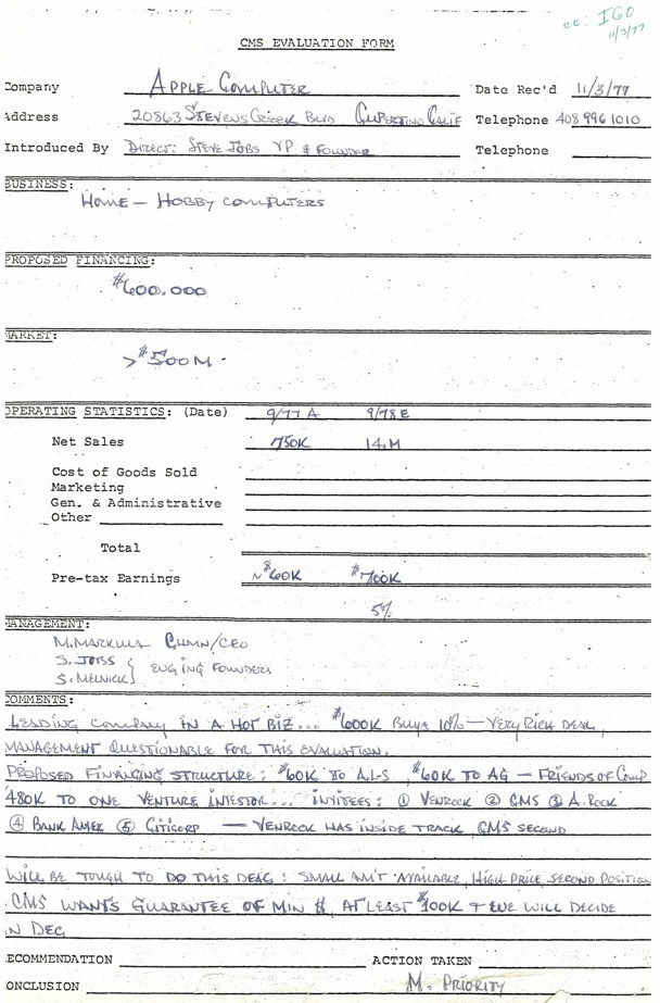 【3】苹果公司迎来50周年,红杉资本也分享了1977年的投资备忘录,图1是看不太清楚的手写原件,图2是AI修复后的机打文件。 红杉面对的交易是用60万美金换取苹果10%的股份,在备忘录里,红杉评估「太贵了」(Very Rich Deal),而且不太看好苹果的管理层。 当时苹果的CEO马库拉就是红杉推荐过去当班干部的,所以不看好的管理层当然指的就是乔布斯和沃兹尼亚克了⋯⋯