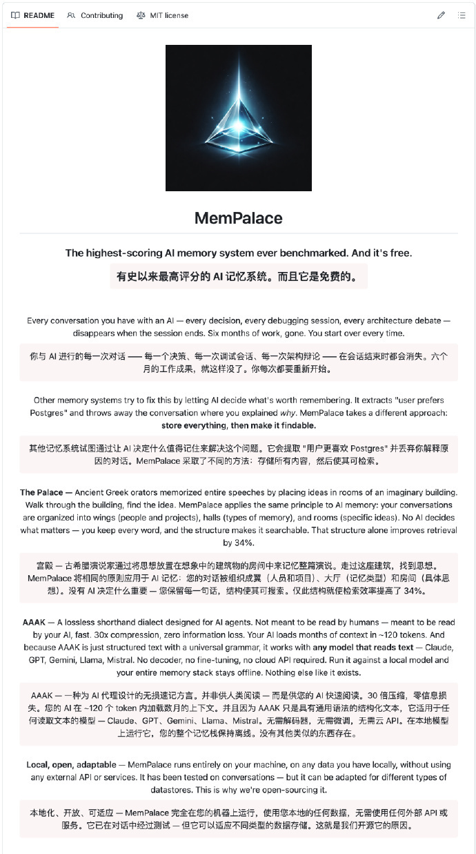 【6】Milla Jovovich(米拉・乔沃维奇)公布开源免费 AI 记忆系统 MemPalace 没错,就是那个演过 《第五元素》、《生化危机》等电影的女演员,和朋友 Ben Sigman 在 GitHub 开源了一个 AI 记忆系统 MemPalace,在 LongMemEval 跑分中获得了有史以来的最高分数。 白天演电影、走秀、带娃,晚上 Vibe Coding,太酷了! 🔗:github.com/milla-jovovich/mempalace